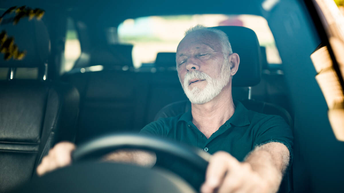 The clip shows dashcam footage from a pair of men, traveling on a highway seemingly on a road trip. The guy riding shotgun is asleep while an older man is behind the wheel. He yawns and opens his eyes wide in an effort to stay awake, but eventually succumbs to his fatigue. Seconds later, the car veers onto the rumble strip then bumps into the median, waking both men with a start.